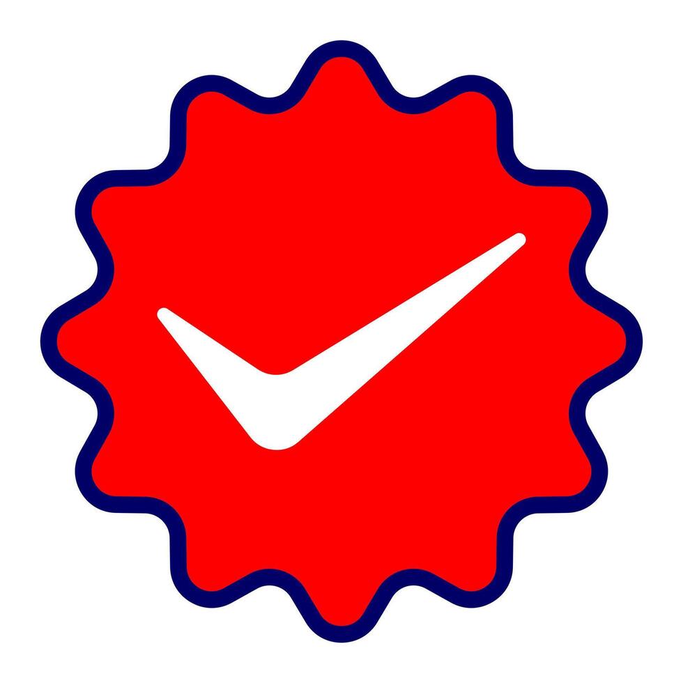 Red badge with white check mark and wavy border on blue outline, ideal for approval, certification, success status, and digital interface confirmation Pro Vector