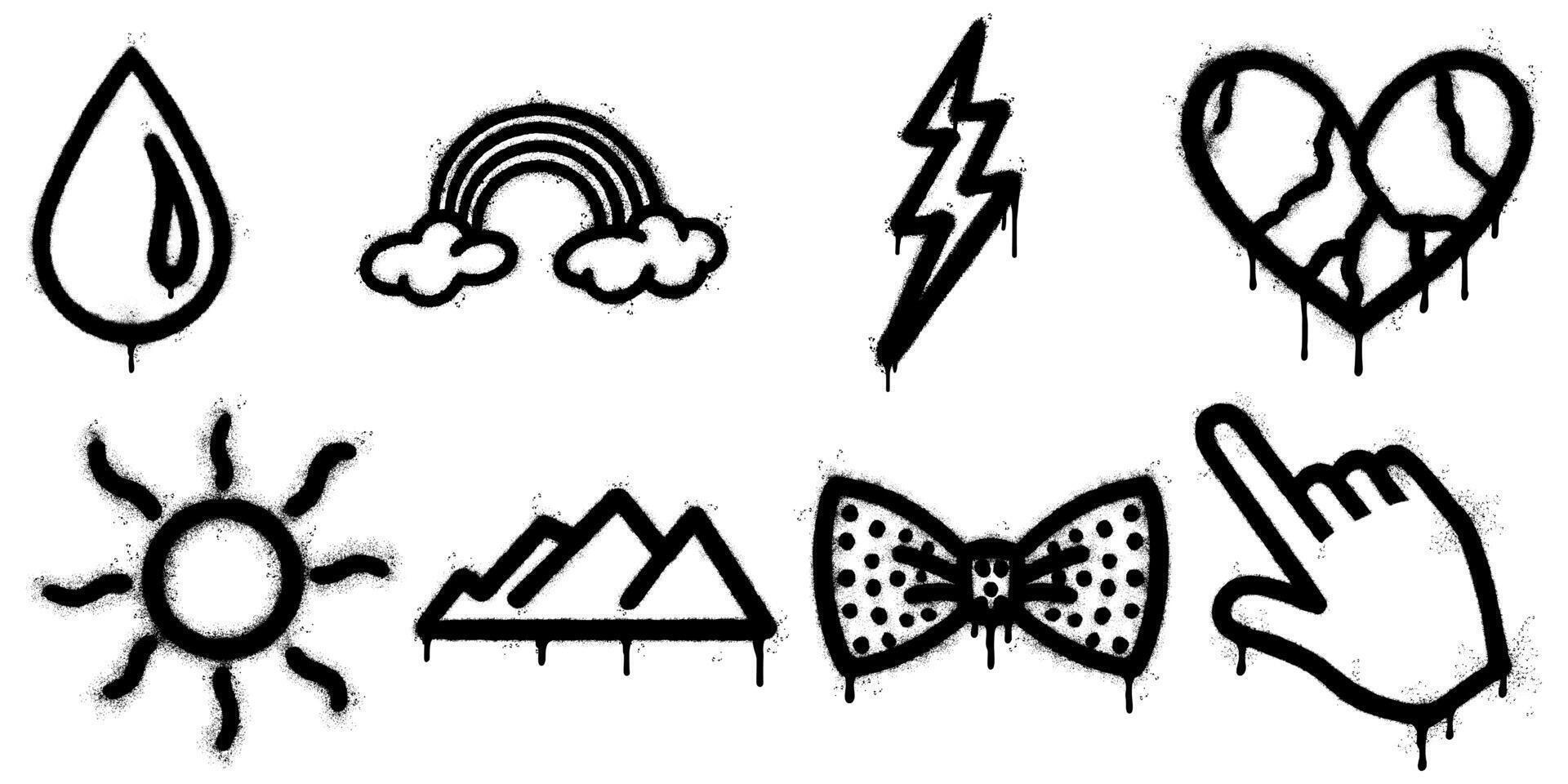Black and white spray paint graffiti icons set with dripping effect including raindrop rainbow with clouds lightning bolt broken heart sun mountains bow tie and hand pointer Pro Vector