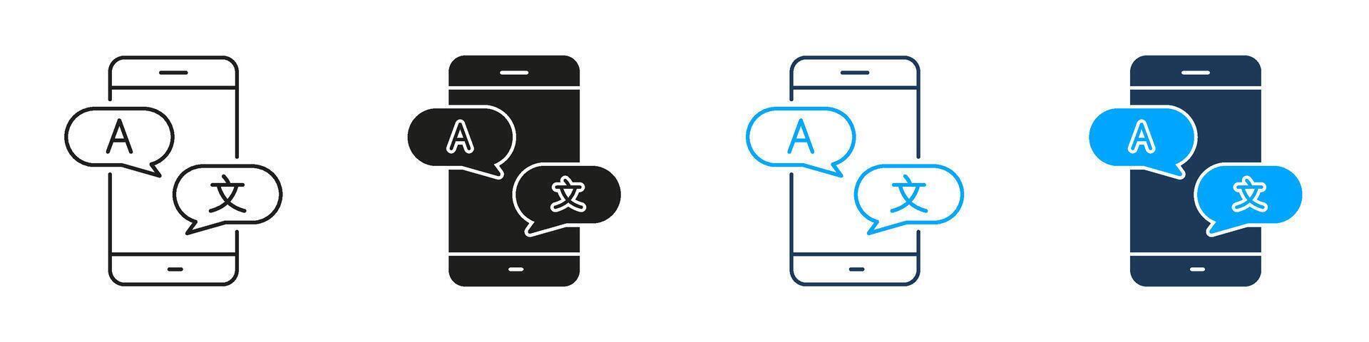 Mobile Translation App Line And Solid Icon Set. Smartphone And Multilingual Chat Bubble Symbol Collection For Real Time Language Conversion And Voice Text Support. Isolated Illustration Pro Vector