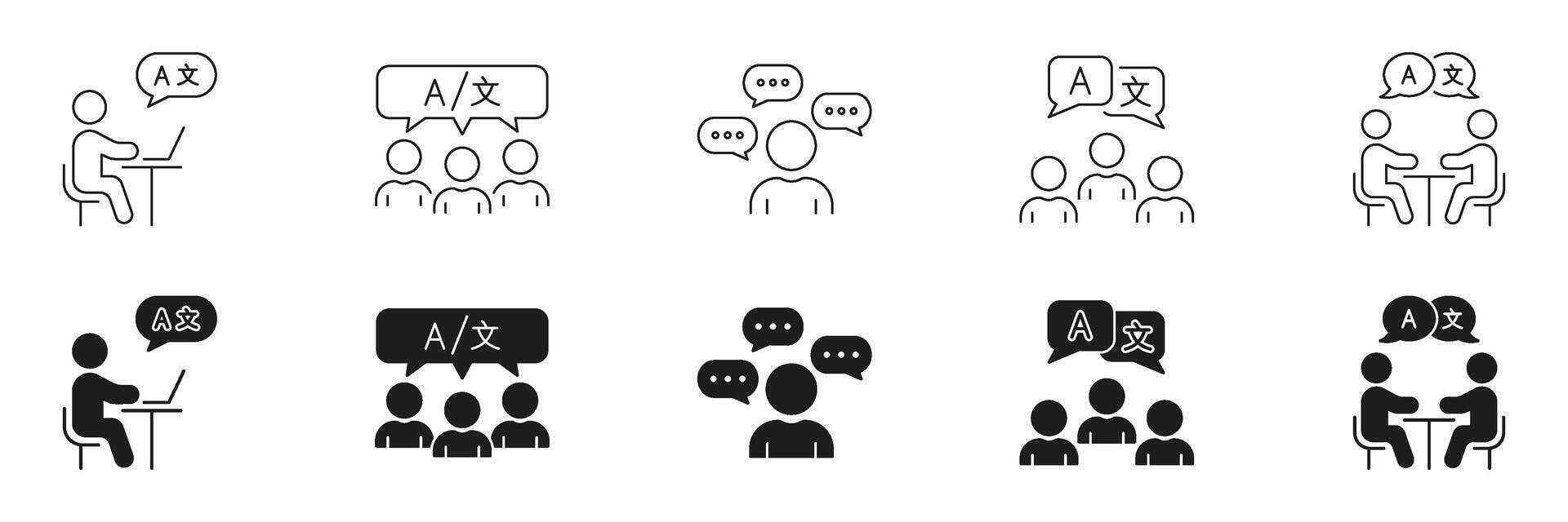 Language Translation And Communication Line And Solid Icon Set. Language Learning And Global Communication. Multilingual Interaction And Conversation Symbol Collection. Isolated Illustration Pro Vector
