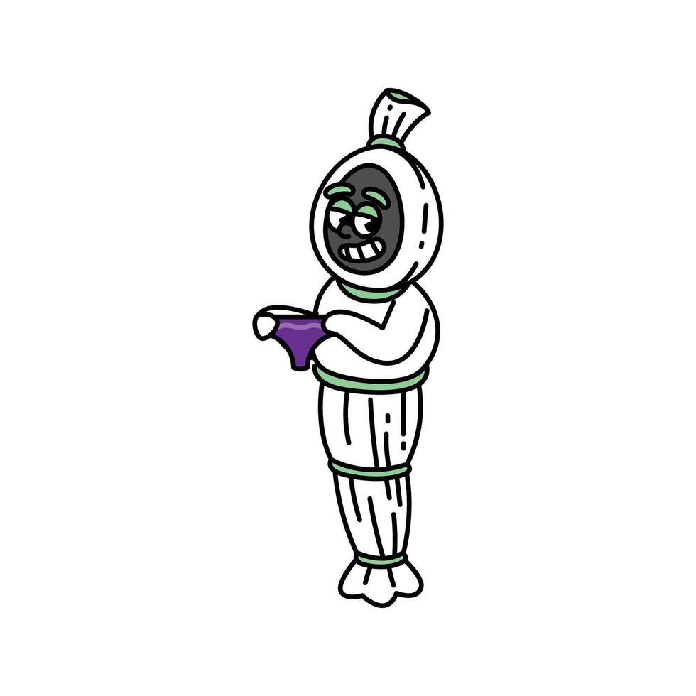 A whimsical cartoon drawing of a pocong, an Indonesian ghost, with a mischievous expression, holding a small purple item. The character is wrapped in white cloth, typical of its folklore. Pro Vector