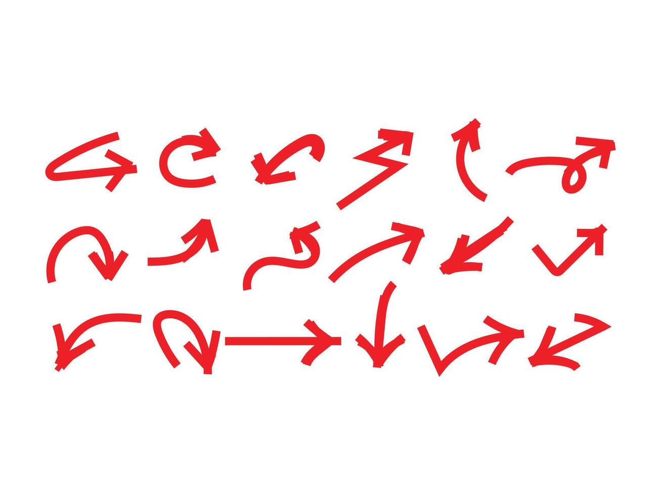 Collection of red hand-drawn arrows in various styles and directions isolated on a white background indicating movement and direction. vector