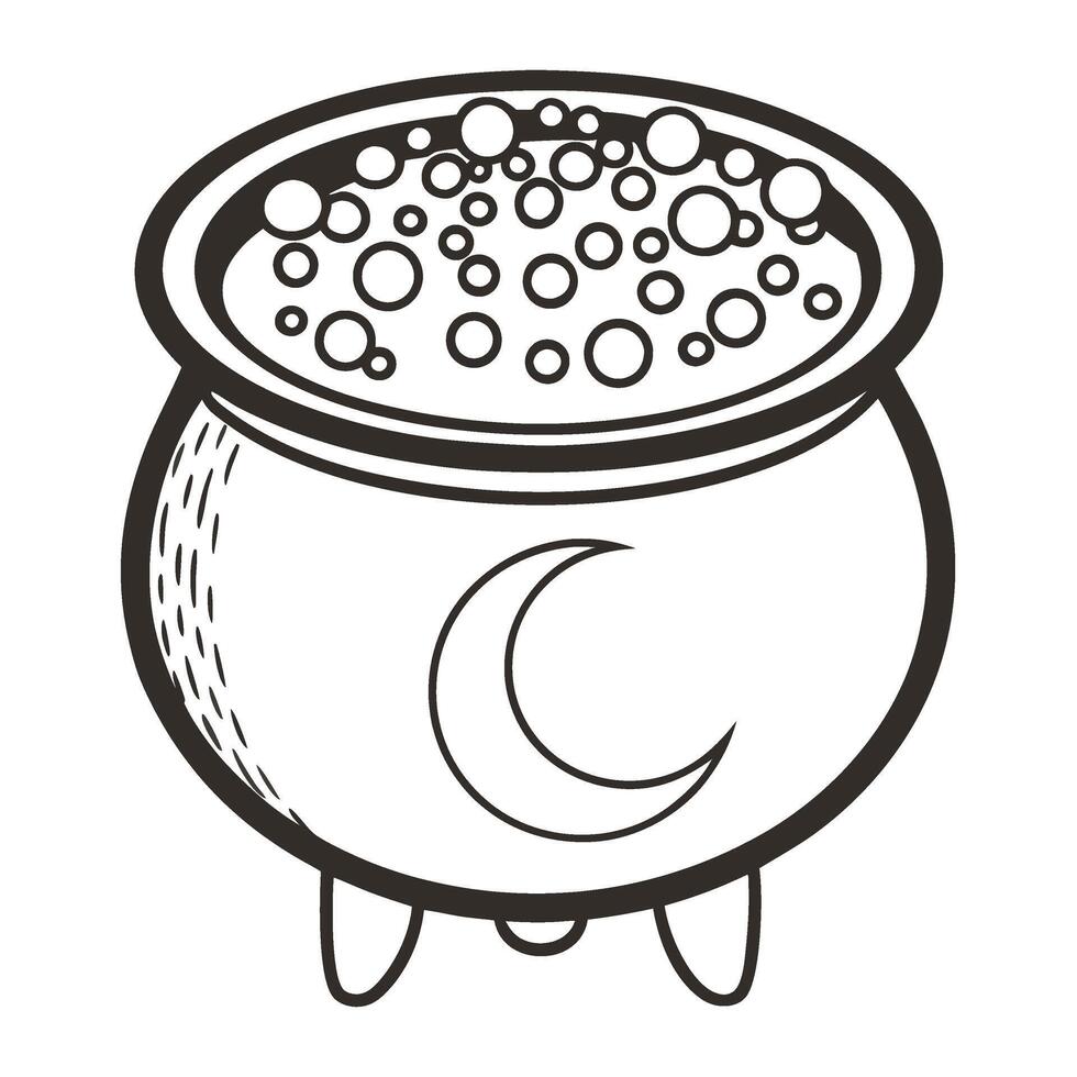 Magic cauldron with bubbling potion and crescent moon symbol witchcraft and alchemy fantasy element, black and white drawing Pro Vector