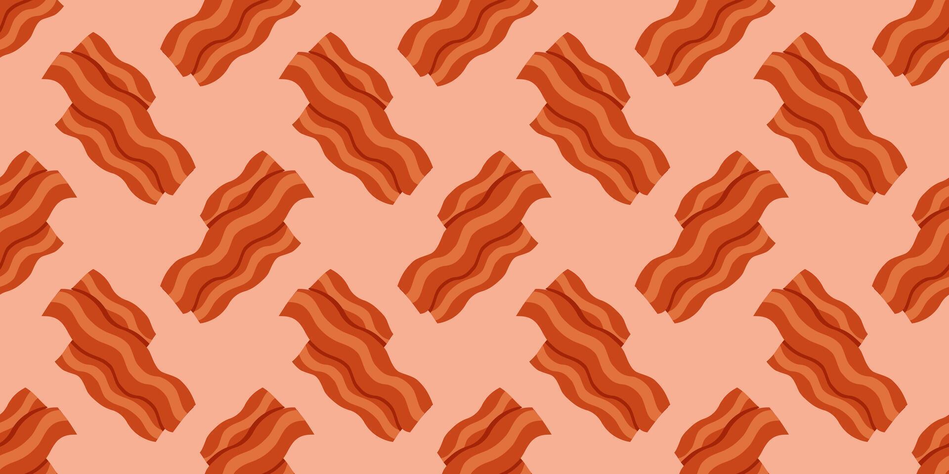 Seamless pattern with bacon slices on pink background. Flat food print. Pro Vector
