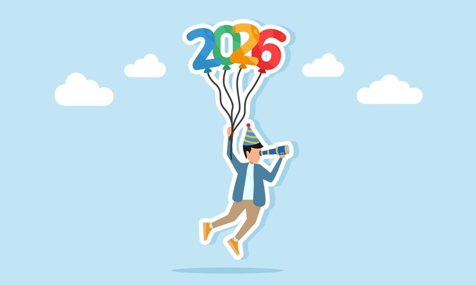 Man wearing hat looking through telescope while hanging from balloons with 2026 text illustration of appreciation for New Year celebration Pro Vector