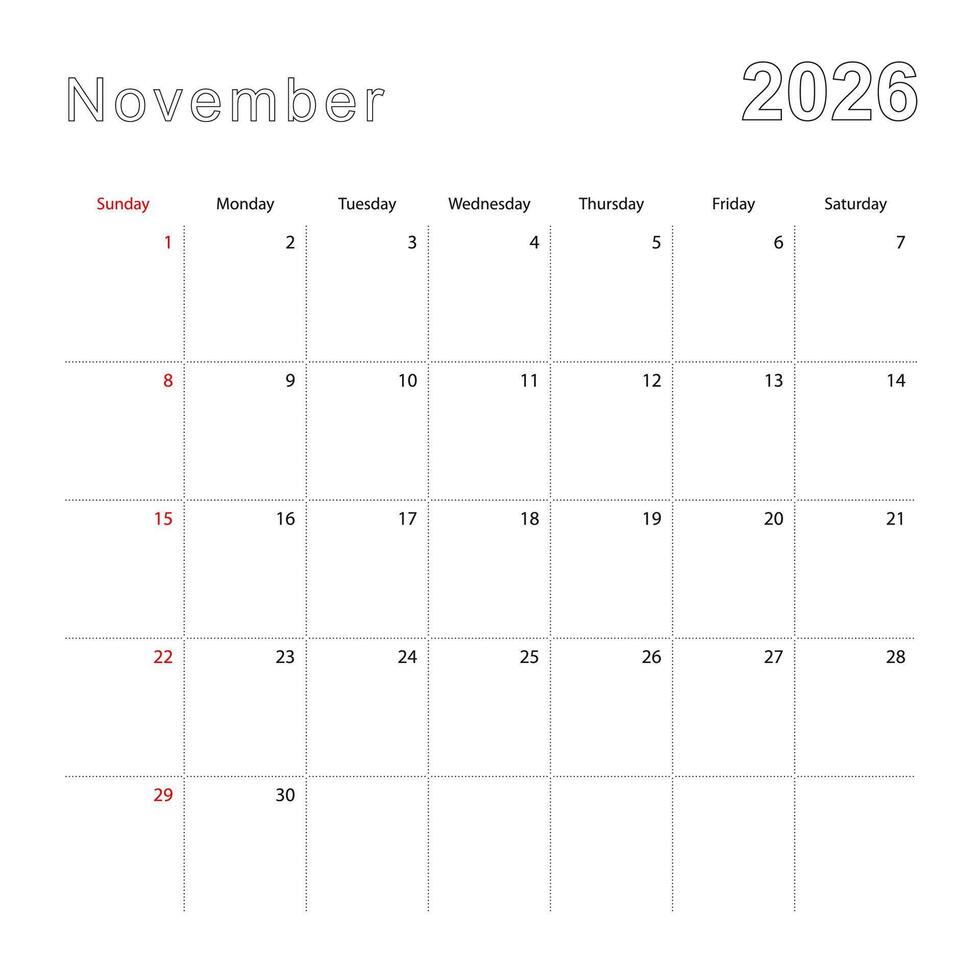 Simple wall calendar for November 2026 with dotted lines. The calendar is in English, week start from Sunday. Pro Vector