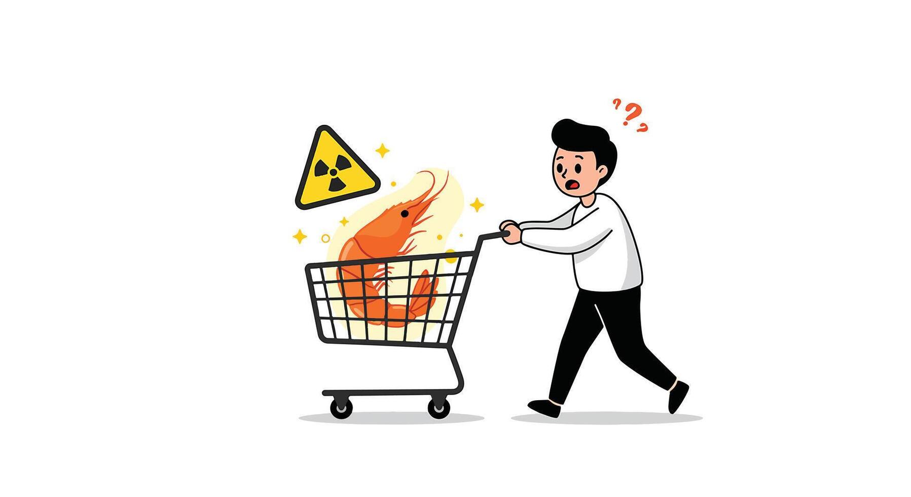 Man Pushing Shopping Cart with Radioactive Shrimp and Question Marks. Pro Vector