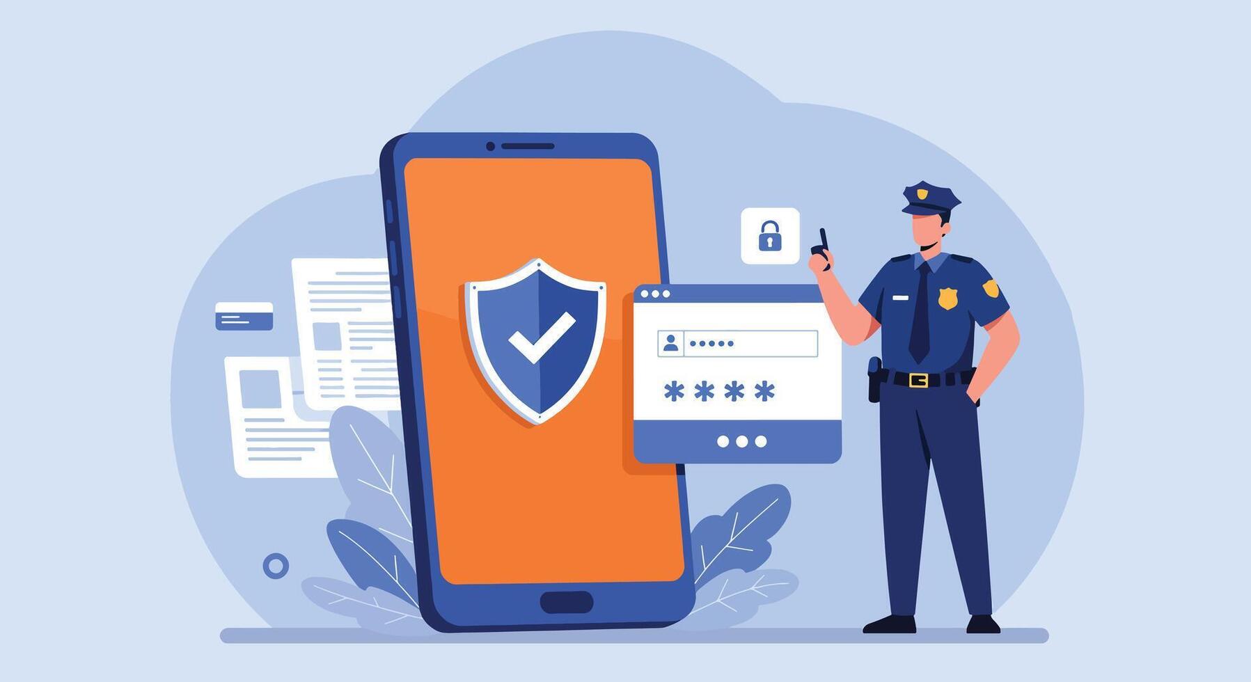 Police Officer Ensuring Digital Security and Data Protection on a Large Smartphone with Shield Icon. Pro Vector