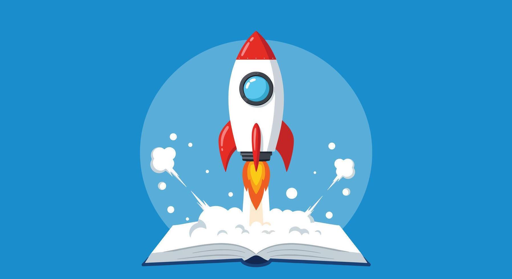 Rocket Launching from Open Book, Symbolizing Knowledge and Innovation. Pro Vector