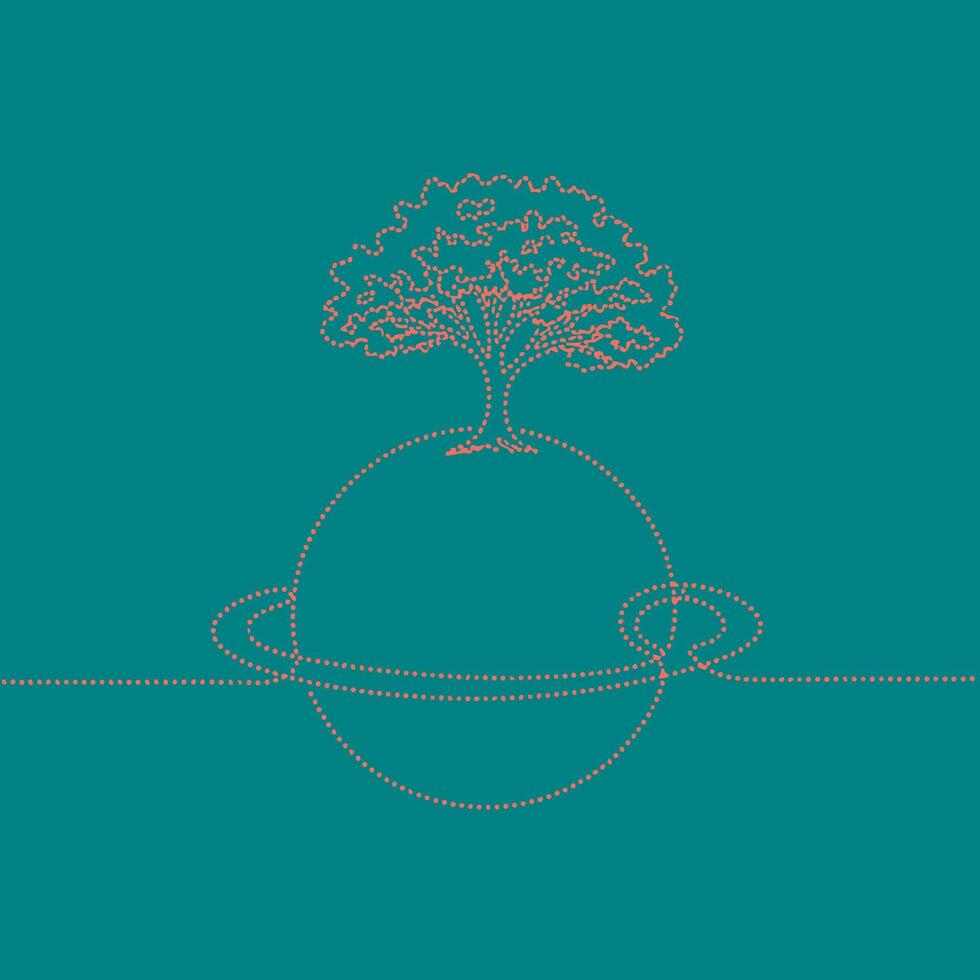 Minimalist line art depicting a large tree growing on a spherical planet with orbiting rings against a solid Pro Vector