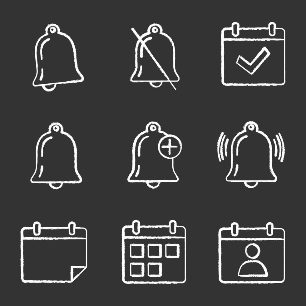 UI UX chalk icons set. Notifications modes, complete day, alarm, reminder, calendar, date range, contact. Isolated vector chalkboard illustrations Pro Vector