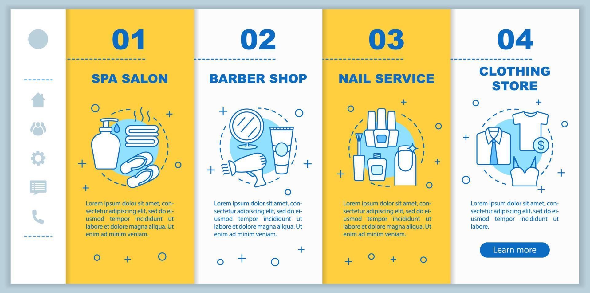 Beauty services onboarding mobile app page screen vector template. Spa salon, barber shop, clothing store walkthrough website steps with linear illustrations. UX, UI, GUI smartphone interface concept Pro Vector