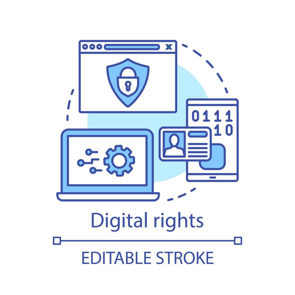 Digital rights concept icon. Intellectual property protection idea thin line illustration. Cyber security. Copyright infringement. Internet hacking. Vector isolated outline drawing. Editable stroke Pro Vector