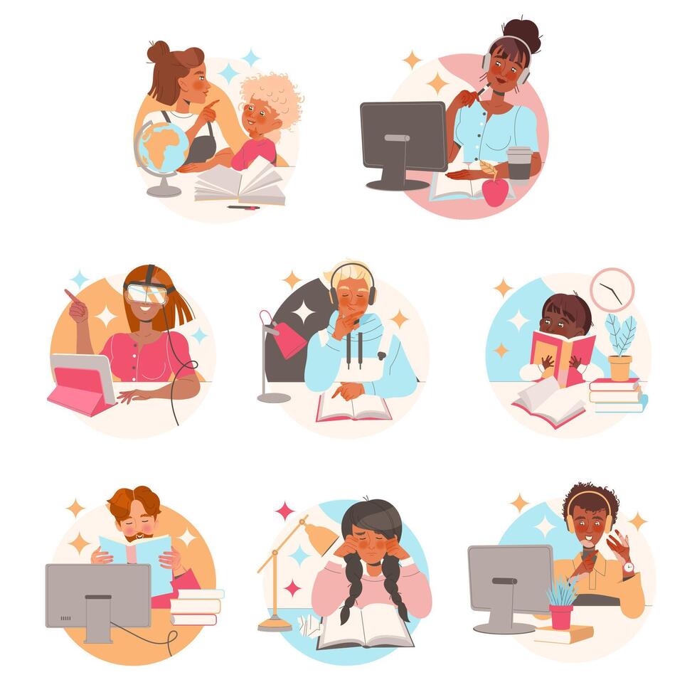 Learning People Character Sitting at Desk with Book and Computer Studying and Gaining Knowledge Set Pro Vector