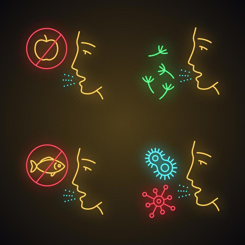 Allergies app icons set. Food, pollen, bacteria intolerance. Allergen sources. Allergic diseases. Cause of swelling. UI UX user interface. Web or mobile applications. Vector isolated illustrations Pro Vector