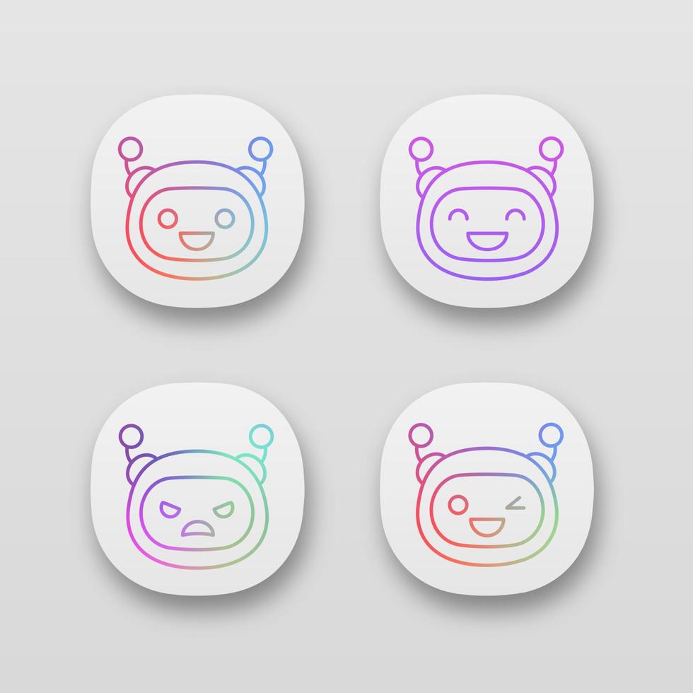 Robot emojis app icons set. Chatbot emoticons. Laughing, happy, angry, winky chat bot smileys. Artificial intelligence. UI UX user interface. Web or mobile applications. Vector isolated illustrations Pro Vector