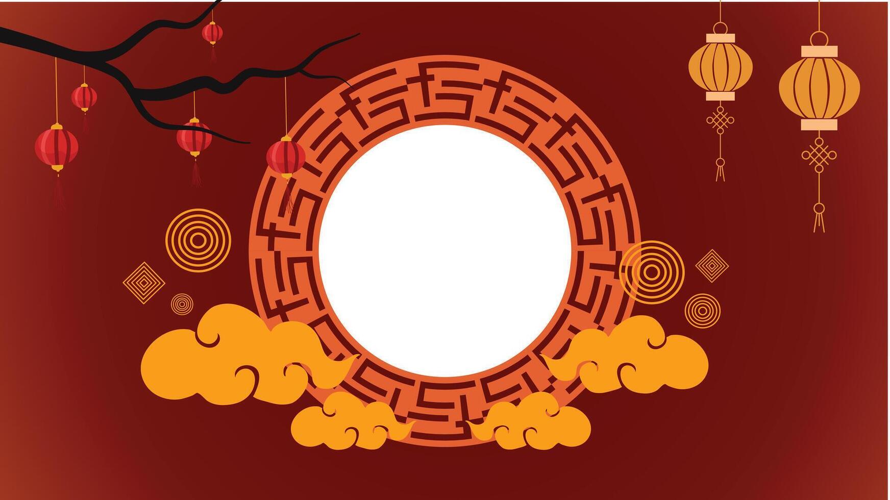 Round frame with lanterns clouds and oriental red background Pro Vector