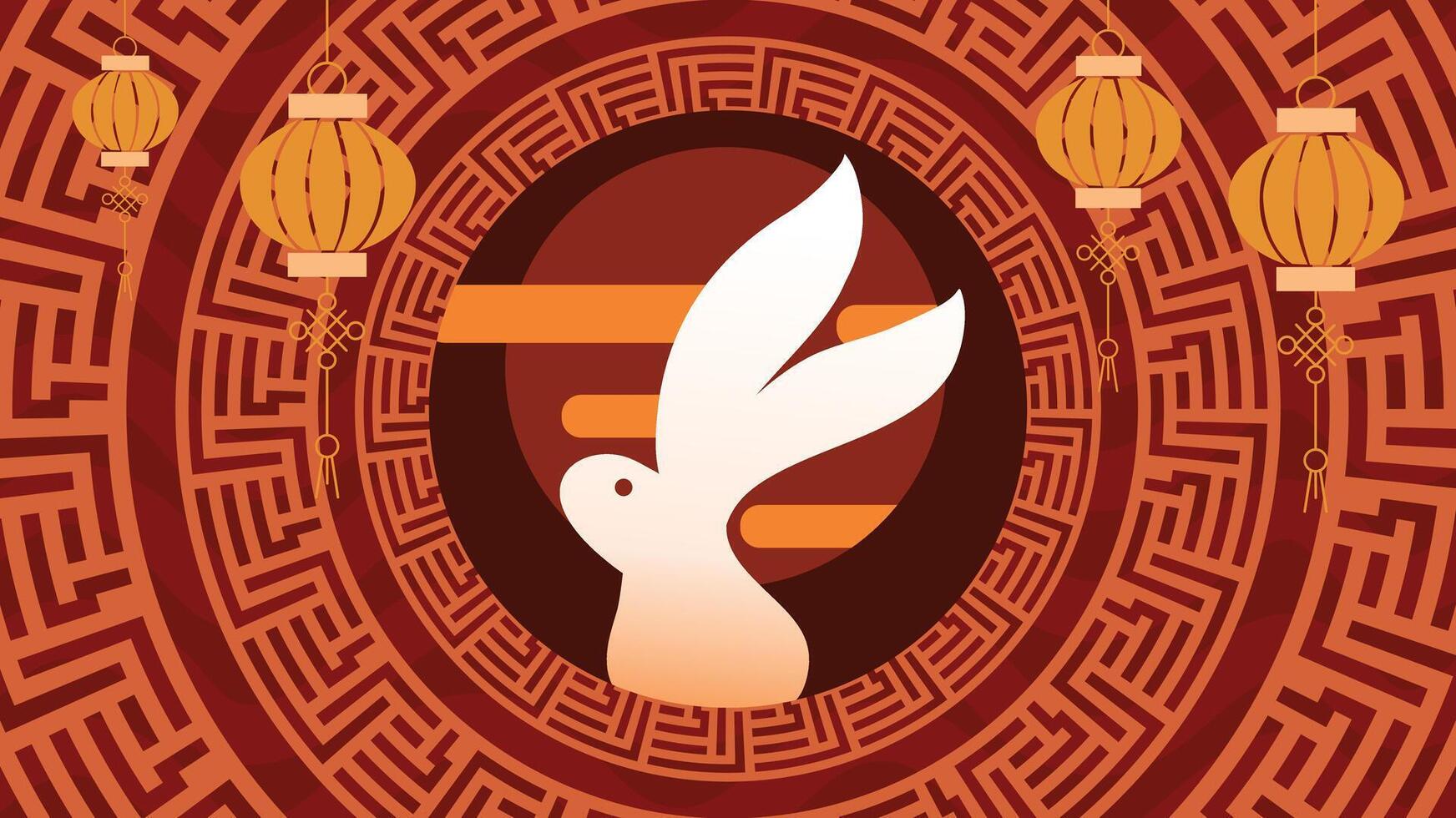 Golden rabbit design inside circular oriental pattern with lanterns Pro Vector