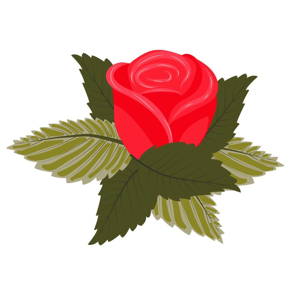 A head of a slightly open red rose with numerous leaves at the bottom. illustration on a white background. Pro Vector