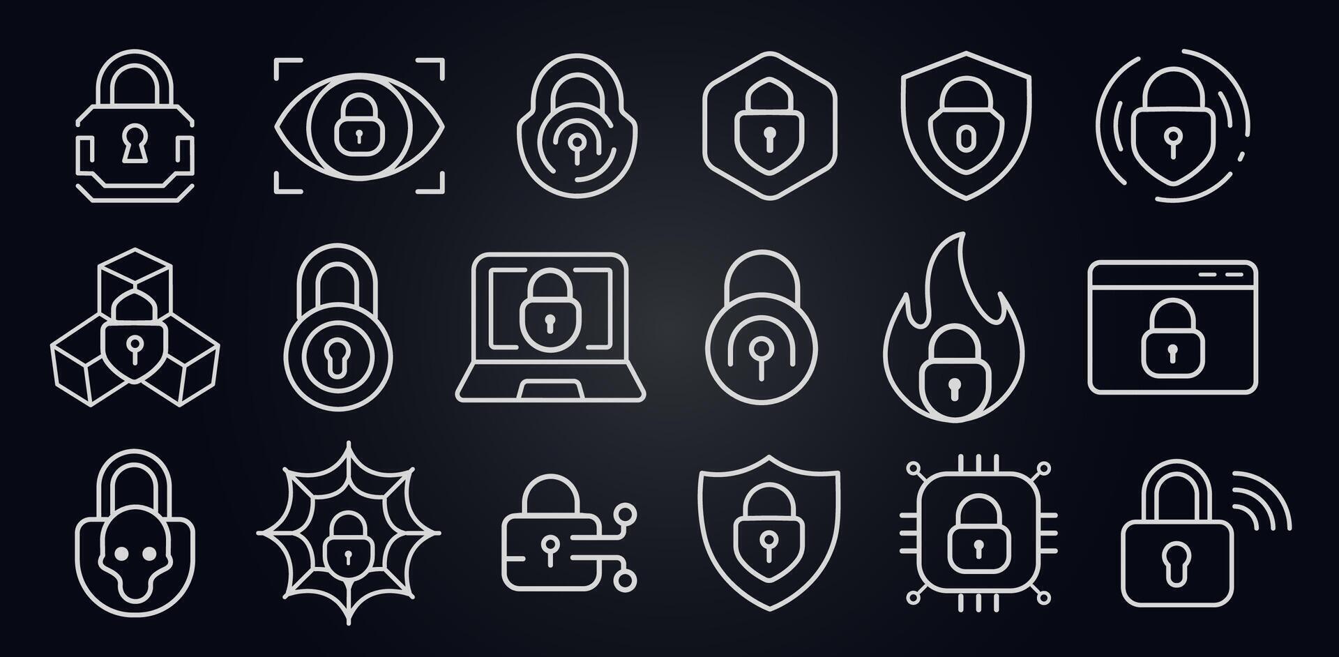 Cybersecurity line icon set with padlocks, shields, browser, circuit chip, virus alert. Digital access control, encryption, firewall concept. illustration. Pro Vector
