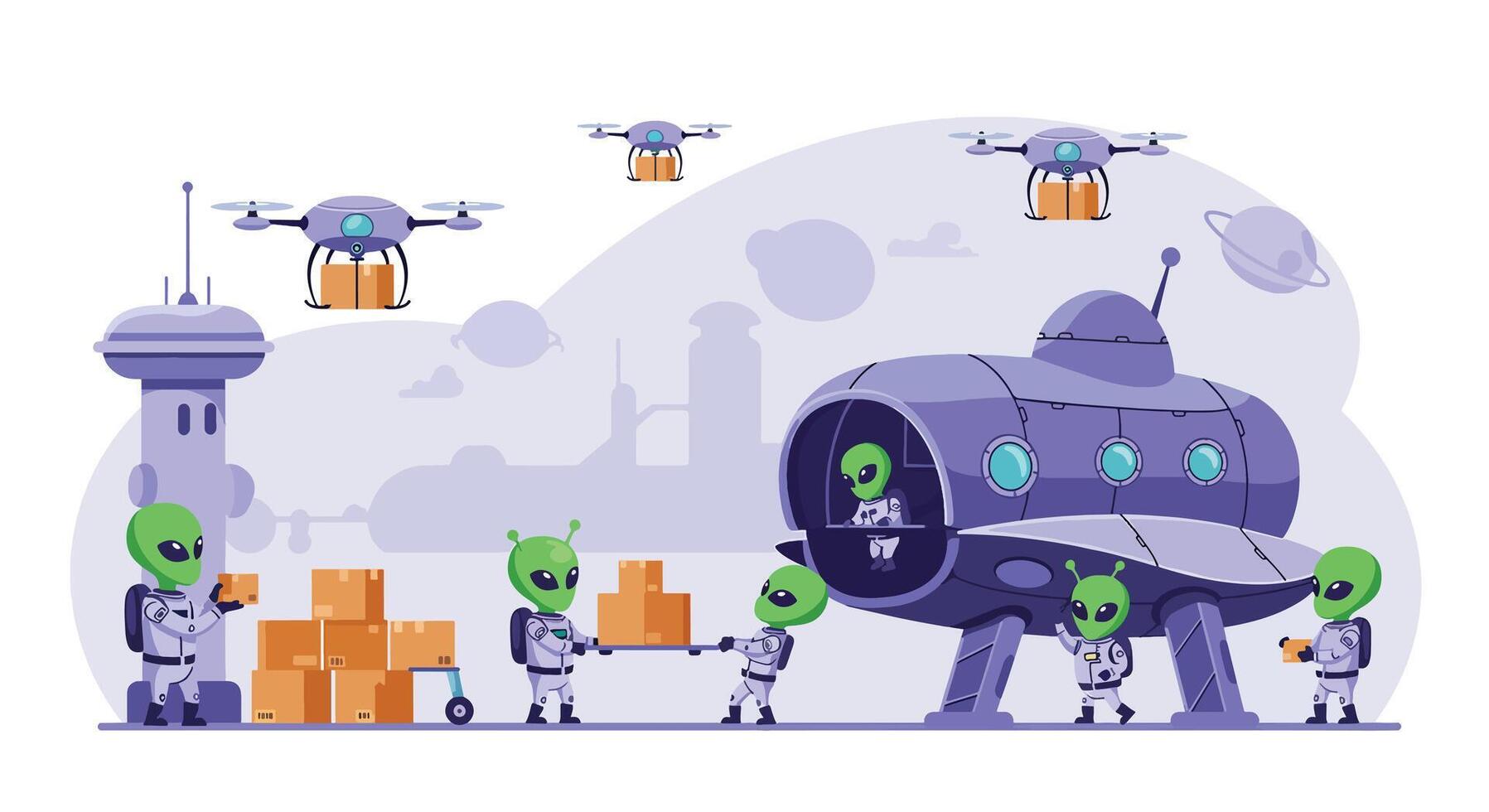 Aliens and Drones Unloading Cargo from a Spaceship on an Extraterrestrial Planet. Pro Vector