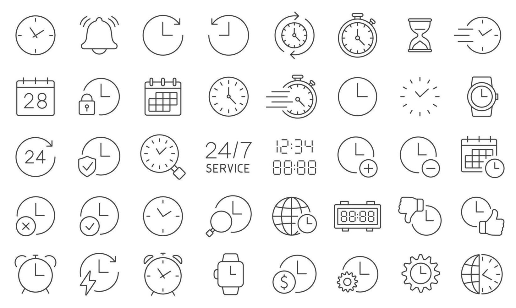 Time Line Icon Set. A Collection Of 40 Editable Stroke Thin Line Icons Representing Clocks, Watches, Timers, Calendars, And Schedules. Perfect For Time Management, 24 7 Service. Isolated Pro Vector