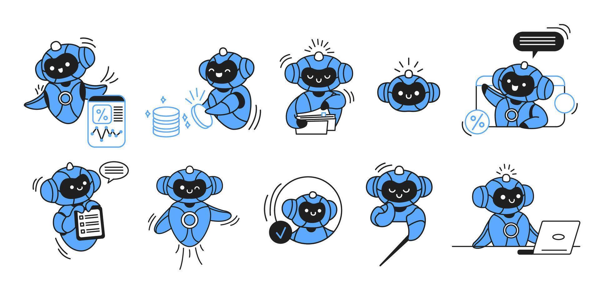Cute blue artificial intelligence illustrations with cheerful expressions performing various tasks like reading, computing, and communicating. Modern, simple design on a white background. Pro Vector