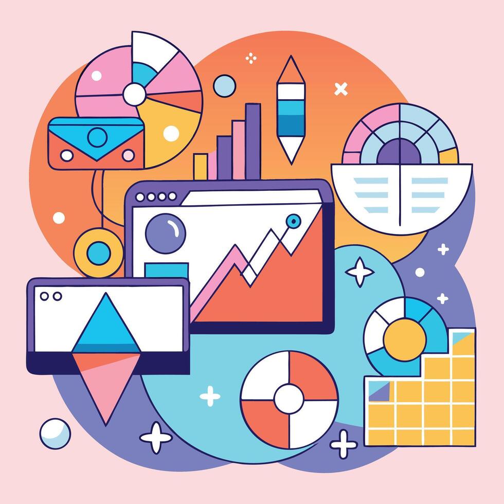 Various financial charts and graphs display insights in this modern abstract artwork vector