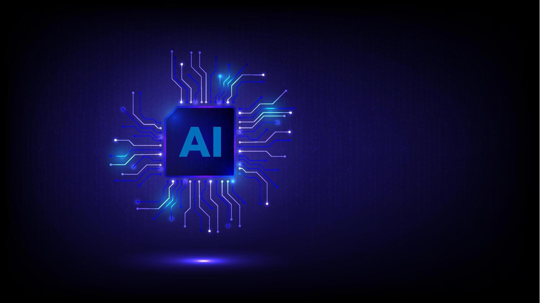 Futuristic AI processor glowing in blue light with digital circuit connections and tech background Pro Vector