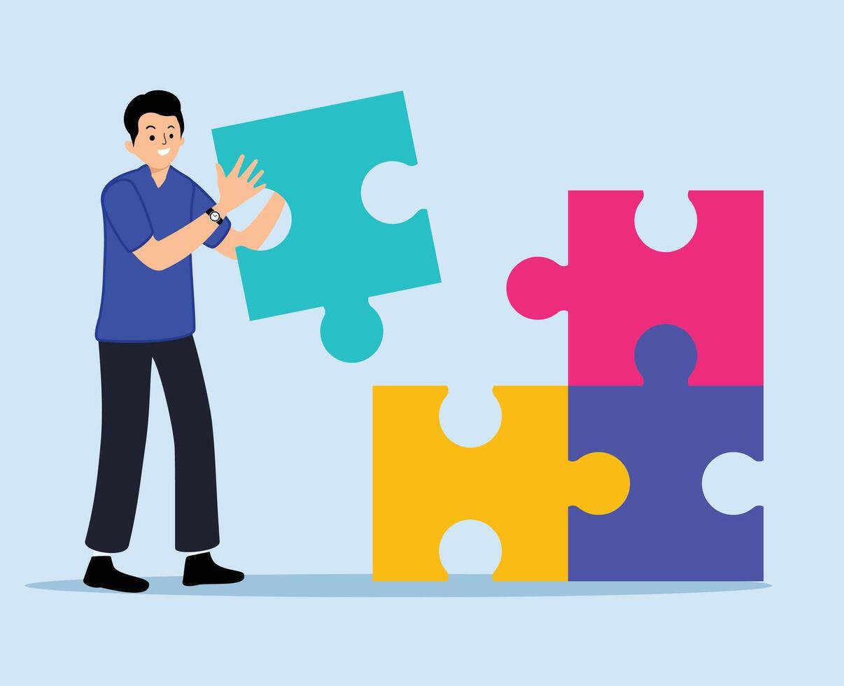 Man connecting puzzle pieces. Problem solving concept Pro Vector