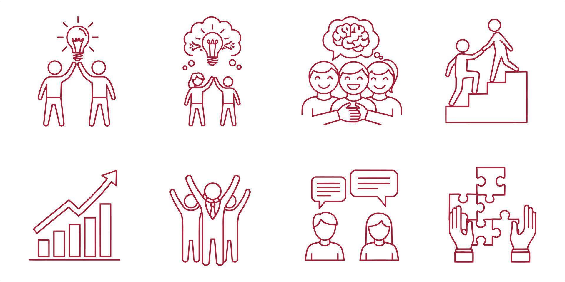 A collection of linear icons depicting teamwork, brainstorming, and mutual support, highlighting collaboration and shared success vector
