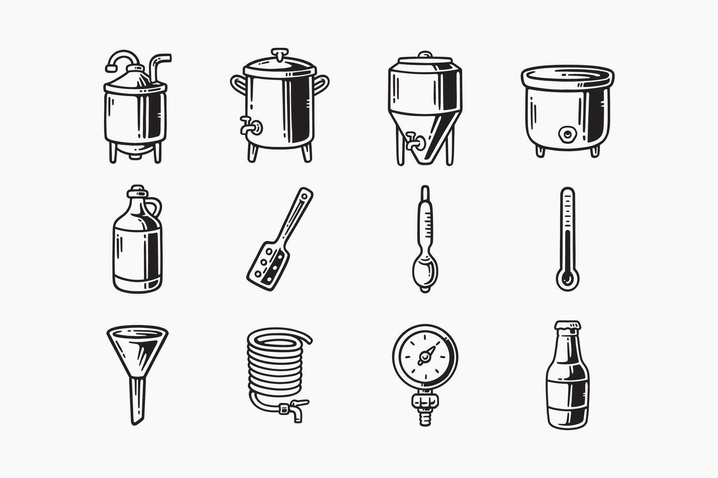 homebrew process elements with tanks, thermometer, bottle. fermentation and brewing tools engraved illustration collection. beer making tools and instruments hand drawn retro doodle design pack Pro Vector