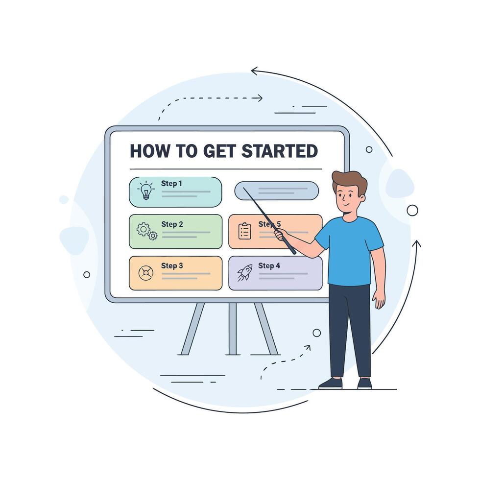 Man Explaining How to Get Started with a Step-by-Step Guide. vector