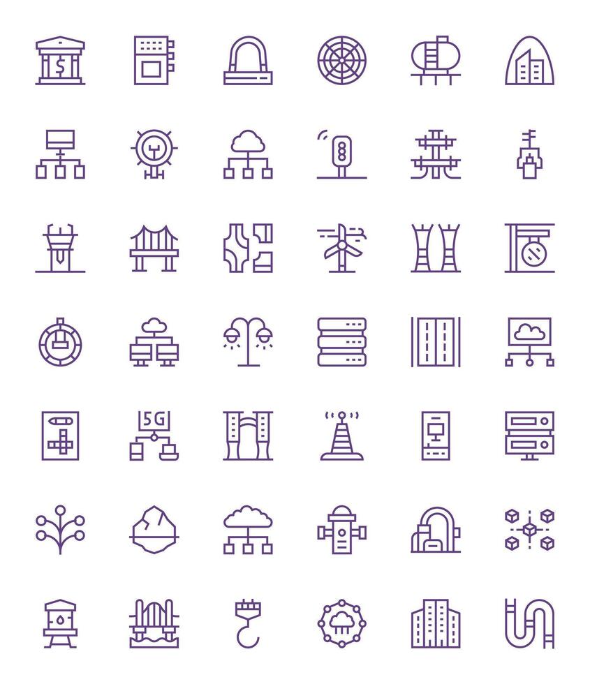 42 High Resolution Icons for Infrastructure in Grid Fitted Regular Line Format Free Vector