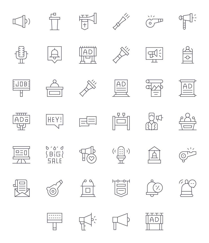 Announcement Icon Library with 40 Thin Line High Resolution Pixel Aligned Designs Free Vector