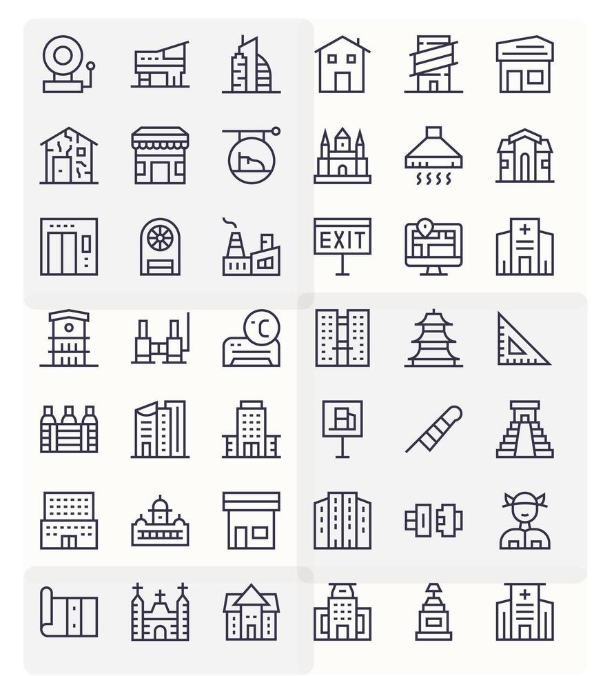 Building Comprehensive Bundle with 42 Pixel Optimized Regular Line 64x64 Icons vector