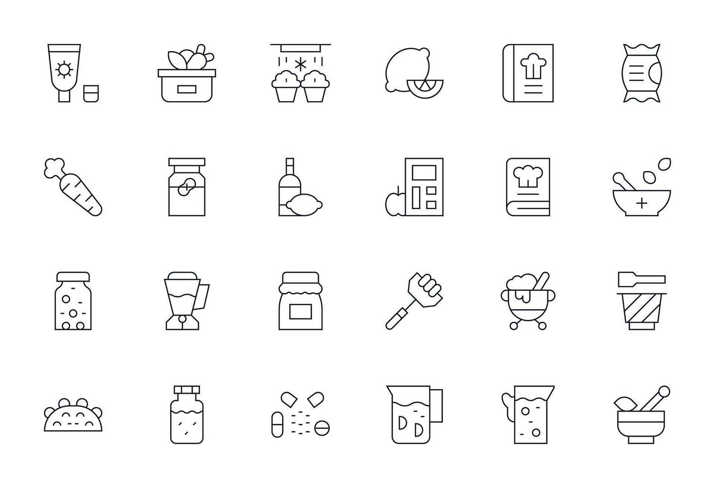 24 Thin Line Icons for Ingredients in crisp 128x128 Pixel Aligned resolution vector