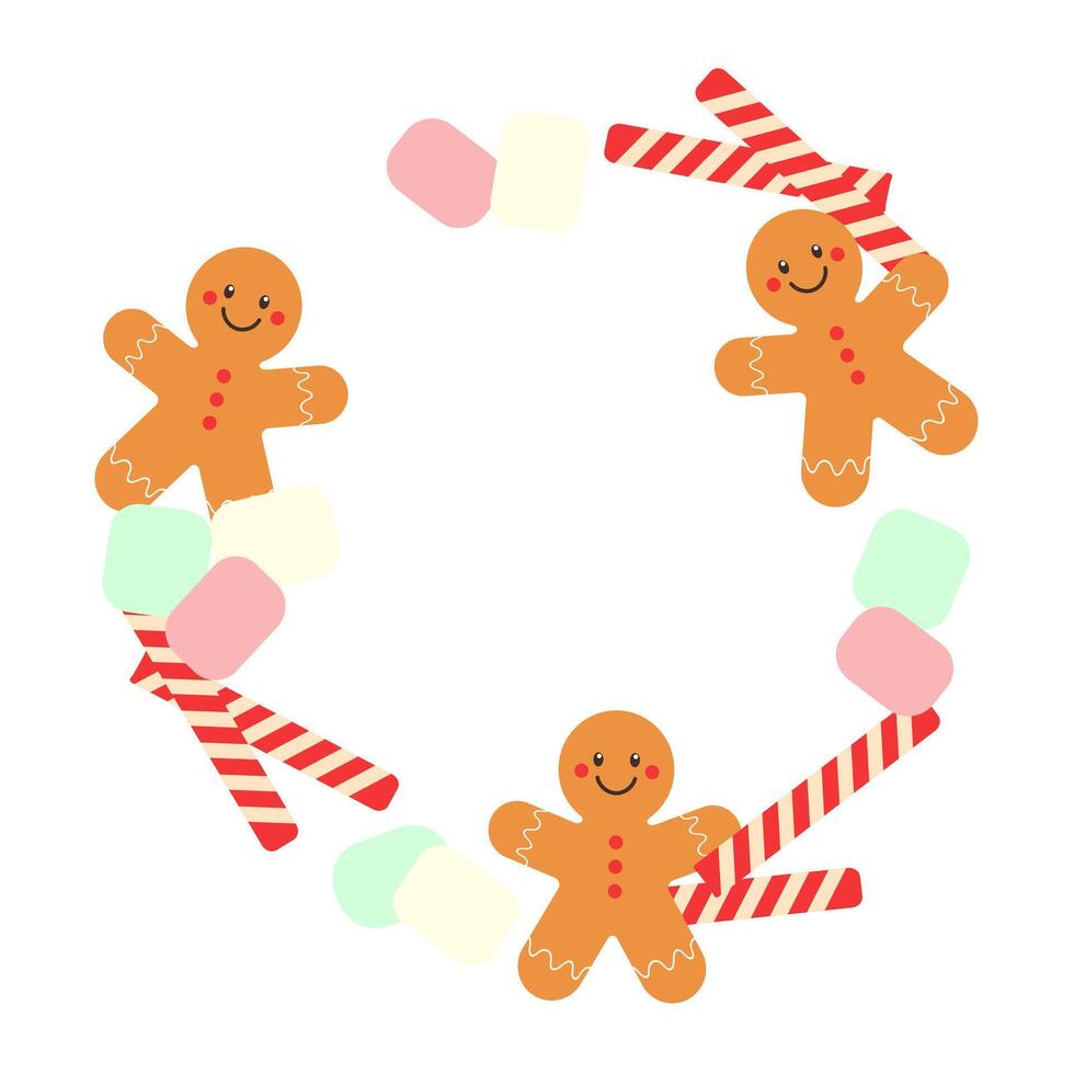 Christmas round frame with wreath of gingerbread and marshmallows, empty space for an insert, an element of festive winter design. Isolated on white background. Pro Vector
