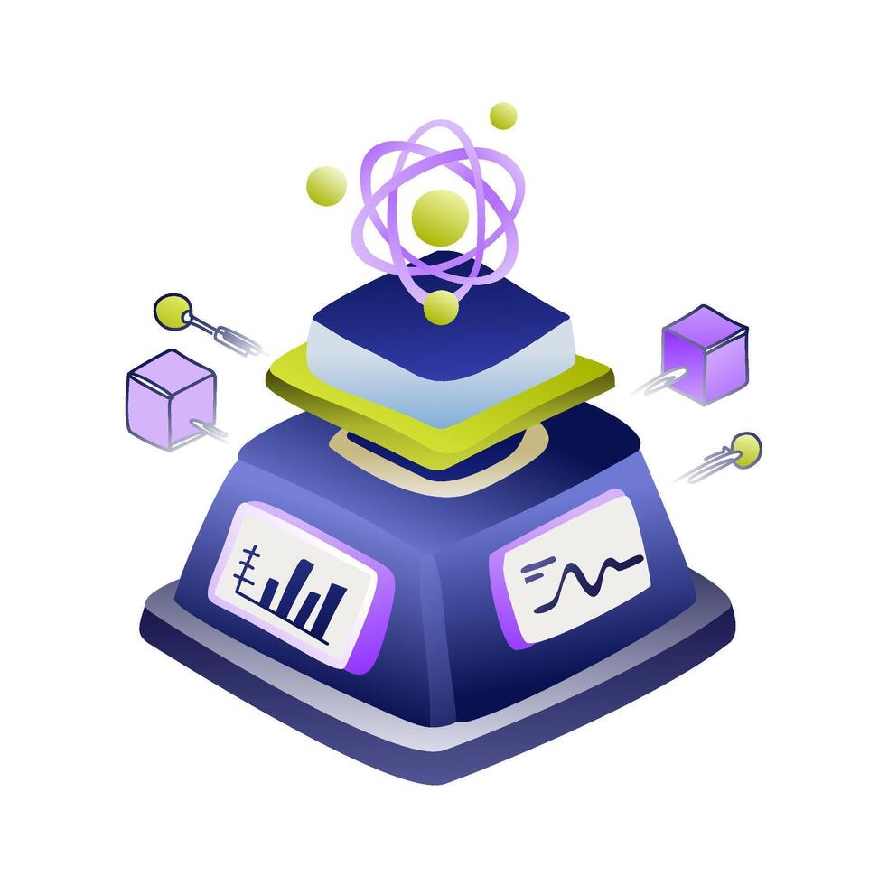 Isometric Illustration of a Scientific Data Processing Device with Atom and Cubes Pro Vector