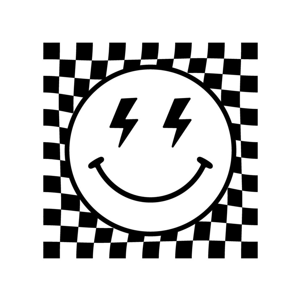 Smiling face with lightning bolt eyes sits on a checkered pattern, creating a retro and energetic mood. Pro Vector