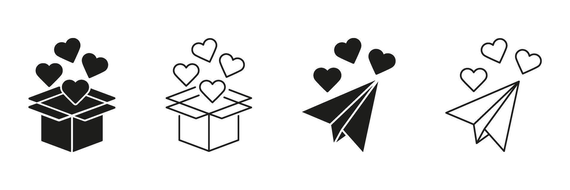 Open Box And Paper Plane With Hearts Line And Solid Icon Set. Love, Surprise, And Communication Symbol Collection. Expressing Affection And Sending Messages. Isolated Illustration Pro Vector