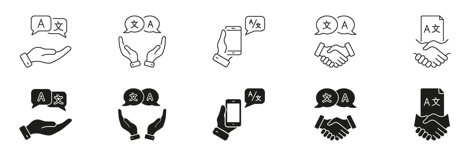 Language Translation And Communication Line And Solid Icon Set. Multilingual Support, Global Interaction. Hand, Speech Bubble, And Handshake Elements. Isolated Illustration Pro Vector