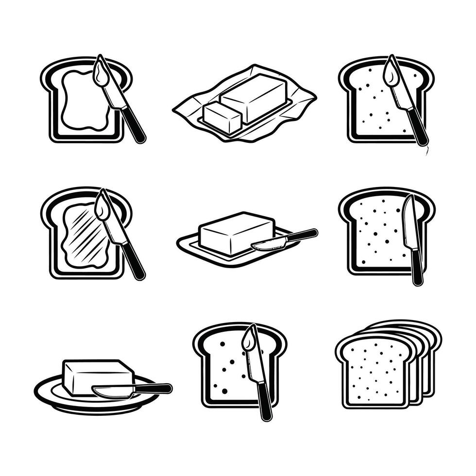 Nine Delightful Illustrations of Buttering Toast Simple Line Drawings of Butter, Bread, and Knives for Culinary Websites and Recipes. Pro Vector