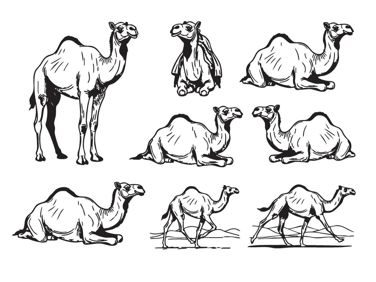 Camel in various standing, walking, and resting poses, in a simple line-art sketch style. Pro Vector