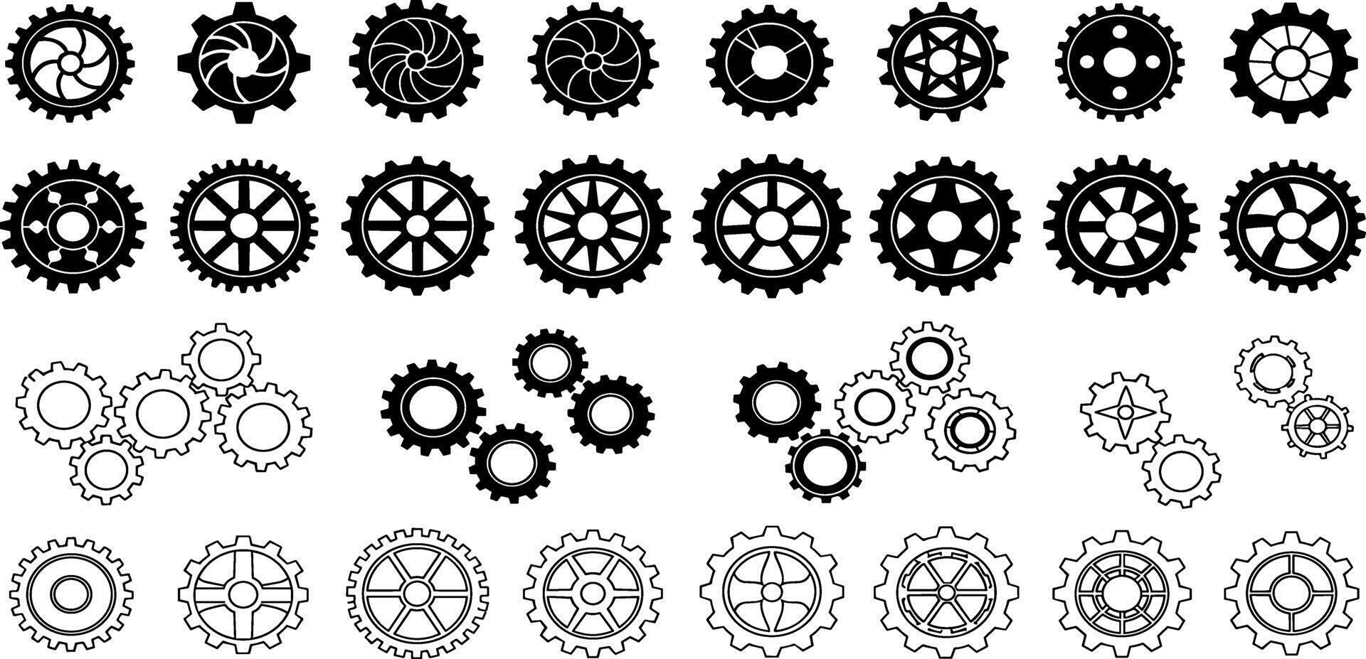 Diverse set of black and white gear and cog icons. Ideal for mechanical, industrial, and technology design, these graphics represent intricate systems and operational processes Pro Vector