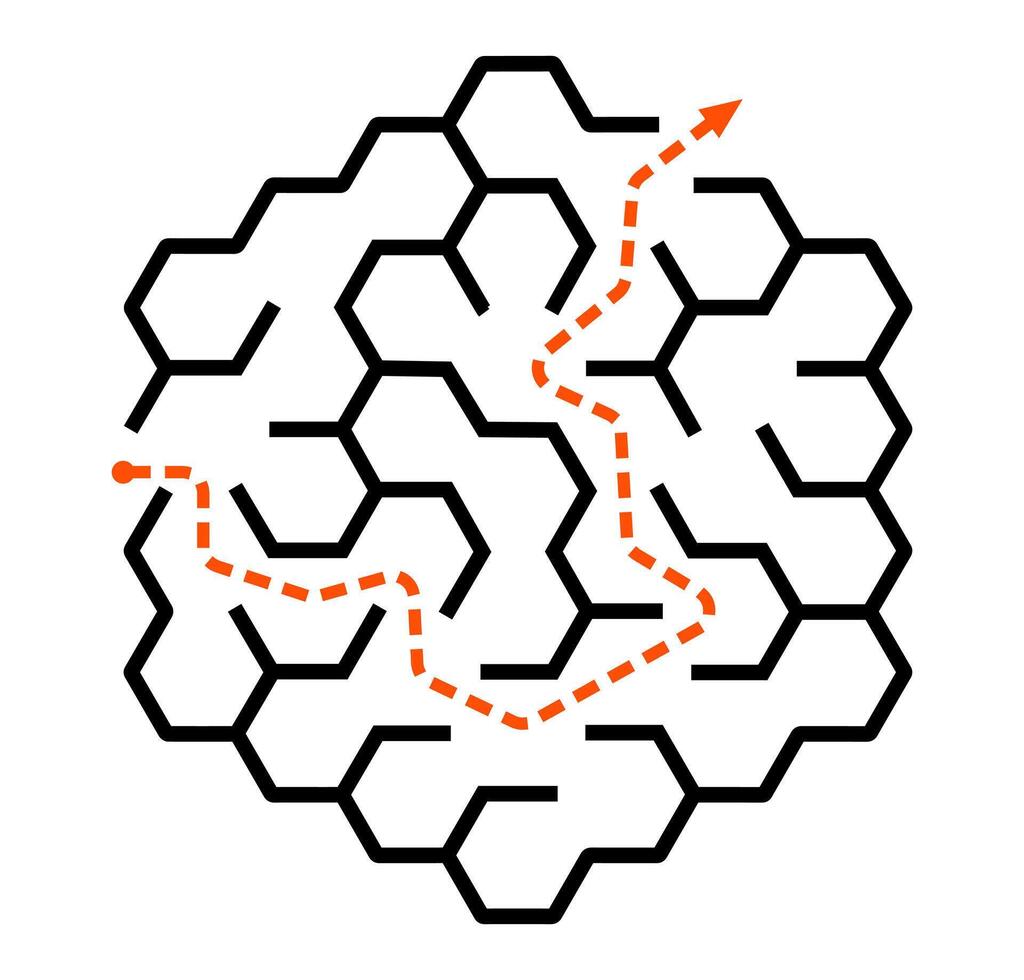 Hexagonal maze design with solution path in orange Pro Vector