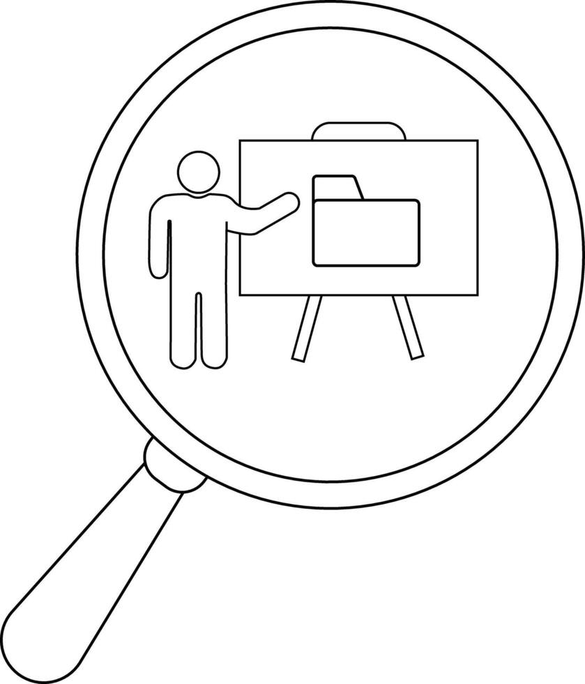 Magnified view of a stick figure pointing at a folder icon on a whiteboard supported by two legs vector