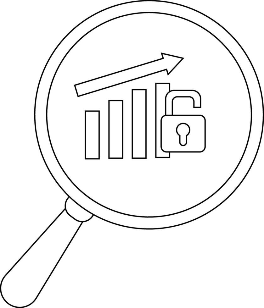A magnifying glass focuses on a bar graph with an upward arrow and an unlocked padlock symbol vector