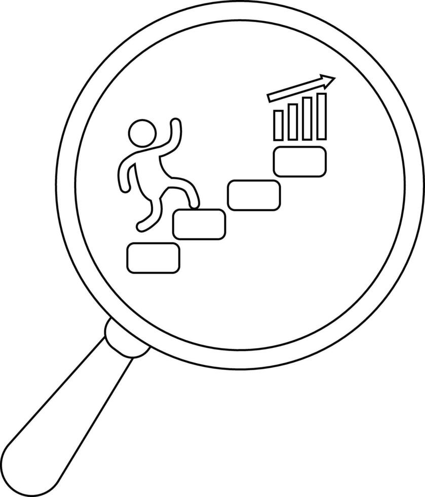 A magnifying glass focuses on a figure climbing steps toward a bar graph with an upwardpointing arrow vector