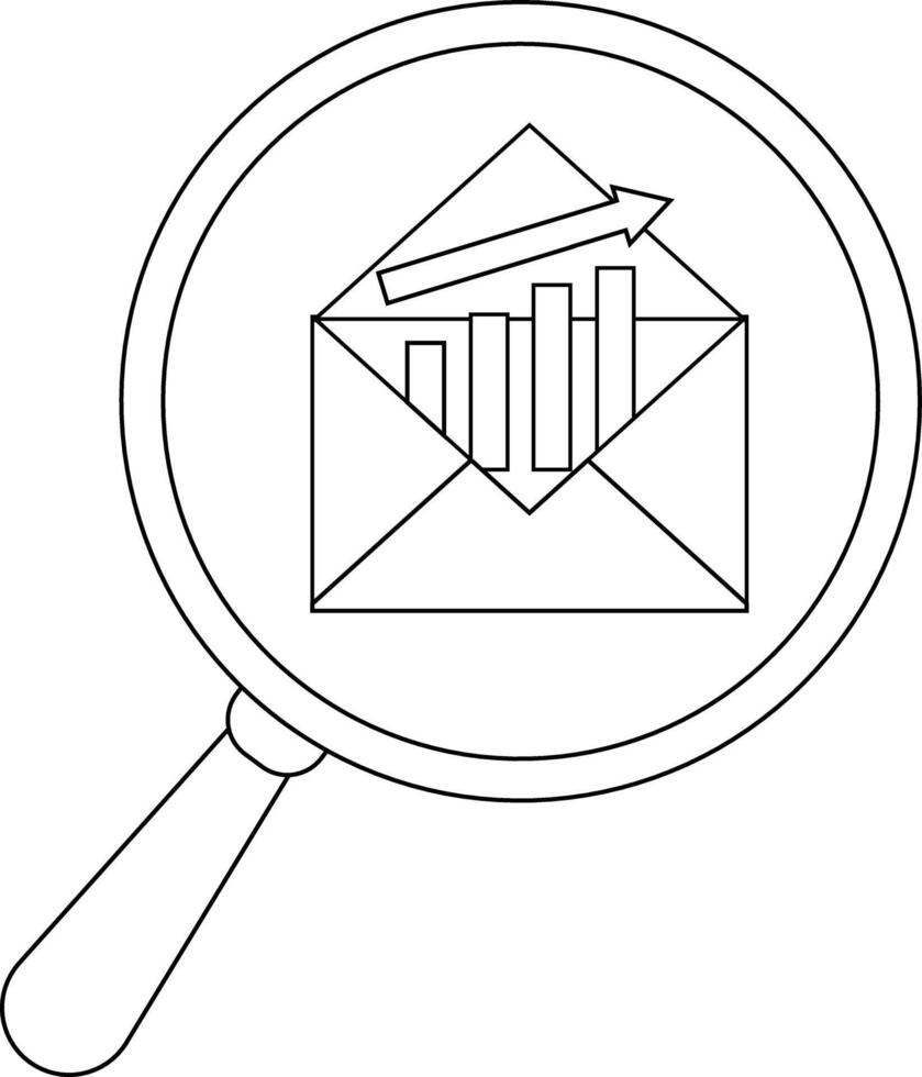 A magnifying glass focuses on an open envelope showing a rising bar graph and an arrow vector